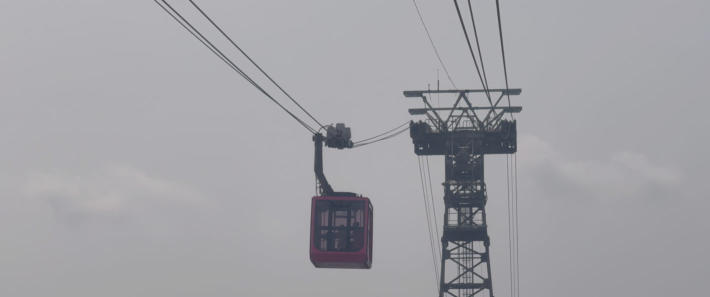 Die Seilbahn hat nur zwei Gondeln Blick von oben auf den Tempel Das ist der Betrieb auf einer normalen öffentlichen Straße