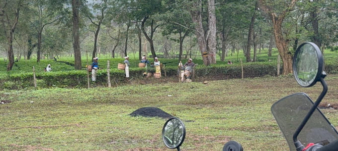 Das Hotel in Kaziranga Wir durchqueren ein großes Teegebiet Die Teepflückerinnen bei der Arbeit TeePause unterwegs Und rauf auf die Fähre Die Überfahrt dauert 1 Stunde Und wieder runter vom Bötchen Noch schnell einen Tee getrunken und weiter geht‘s Die Straßen der Majuli Insel In unserer Unterkunft angekommen