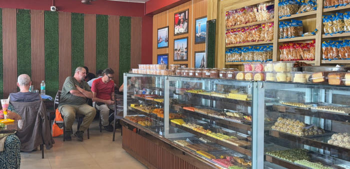 Heute unsere erste Verschnaufpause Eine riesige Gebäckauswahl Gleich geht es weiter Am Tempel angekommen Kanyakumari, der südlichste Punkt Indiens Es ist viel los hier Wir kämpfen uns durch den indischen Verkehr Begrüßung am Stadt Eingangstor Ziel erreicht. Wir sind angekommen Alle beobachten den Sonnenuntergang