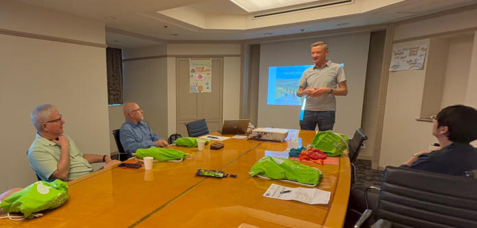 Frühstück in 40. Stock. Blick aus dem Fenster beim Frühstück Fahrt mit der Metro, die heute am Sonntag wenig Fahrgäste aufweist Und da ist er: der Tokio Tower Der Chronist auf der oberen Plattform des Tokio Tower in Aktion Und hier sieht man Tokio von oben Der Zojo-ji Tempel Am Fuße des Tokio Tower Ich gönne mir eine Auszeit im japanischen Garten des Hotels Im Teich schwimmen viele Koi‘s Unser Tourguide Marko beim Einführungs-Briefing Und hier eine Übersicht, was so morgen alles los ist
