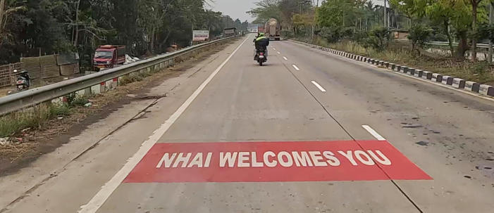 Heute Morgen sind die Straßen leergefegt, sehr Verkehrsarm Die sitzen auf den Bambusstangen, damit sie nicht herunterfallen. Geschwindigkeit: 80 km/h. Eine Prozession auf der indischen Autobahn Die Ortschaften malen die Begrüßung auf die Straße Da will ich mal den Ort Oestereiden bekannter machen Viel Leben im Viertel von unserem Hotel Helmut hat seine Jacke gefunden