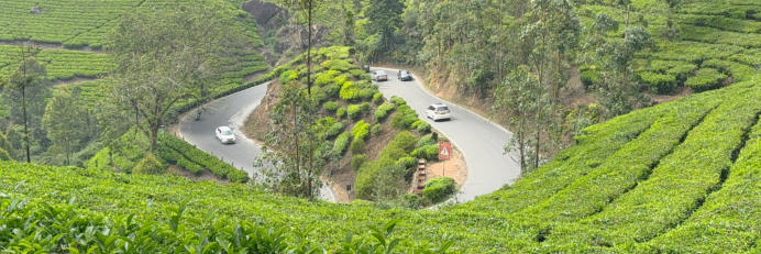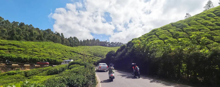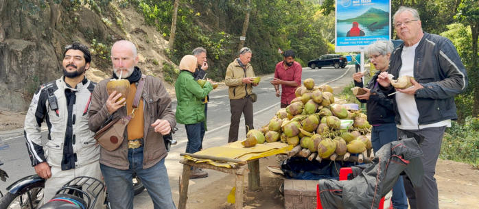 Wir fahren mitten durch den Teeanbau TukTuk Parade Pause unterwegs mit Kokosnusssaft Kleiner Tempel in der Landschaft Viele unübersichtliche Kurven Die beiden Tee-Spezialisten beim fachlichen Erfahrungsaustausch