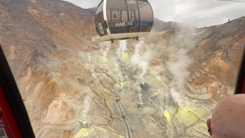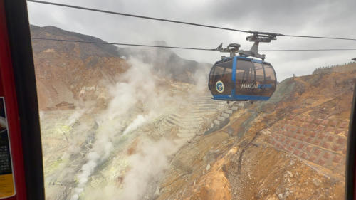 Die geplante Gesamtstrecke Und ab in den Zug Nochmal umsteigen Großer Andrang an der Standseilbahn Zu guter letzt in die Seilbahn Wir schweben über ein geothermisches Feld der Fuji Nach langem Anstieg habe ich den Pass erreicht Auf einem Großteil der Strecke begleitet uns der Fuji